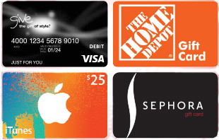 * Subject to availability. See gift cards for details, terms, conditions and (if applicable) fees. All trademarks are property of their respective owners. Product may not be available in all states. The Visa Gift Card is issued by Sunrise Banks, N.A. pursuant to a license from Visa U.S.A. Inc. Sunrise Banks, N.A.; Member FDIC. This card may be used in the U.S. and District of Columbia everywhere Visa debit cards are accepted. The card may not be used at any merchant, including Internet and mail or telephone order merchants, outside of the U.S. or District of Columbia.